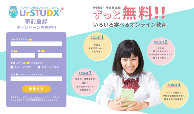 有限会社教育図書⼆十一(きょういくとしょ21、本社:東京都豊島区、代表取締役:吉田敬亮・新中義一)は、個人、法人問わず、誰でも先生になることができ、生徒に学校教育や社会で生きていく中で必要なスキルを学べる機会を提供する教育プラットフォーム「UrSTUDX(ユアスタディクス)」の事前登録期間の生徒登録者に対し、「無料特別クラス受講キャンペーン」を3月に開始しました。