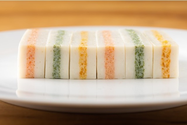 柚子のさわやかな香りの黄、国産あおさの風味豊かな緑、辛子明太子のピリッ、プリッが刺激的な薄紅。白には、最高級のイトヨリダイを使用して、やさしい縞模様が誕生いたしました。見た目はまるでサンドゥイッチ。そのままお皿に盛っても可愛らしく、気軽につまんだり、食材とも合わせやすいので、オードブルやサラダとしてもアレンジが効きます。