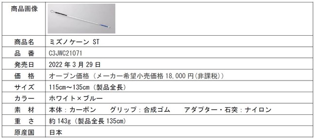 ミズノは、軽量性と操作性を追求したカーボン製白杖「ミズノケーン ST(エスティー)」を、初めて商品化しました。社会福祉法人日本ライトハウス、社会福祉法人日本点字図書館で3月29日に発売します。