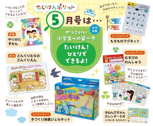 5月号は、除菌が楽しくなる「除菌ジェルキット」や、紐の結びをマスターできる「結びのれんしゅう」など、子どもが自ら「やってみたい!」とやる気になる教材がたくさん! その意欲が学びの出発点となります。