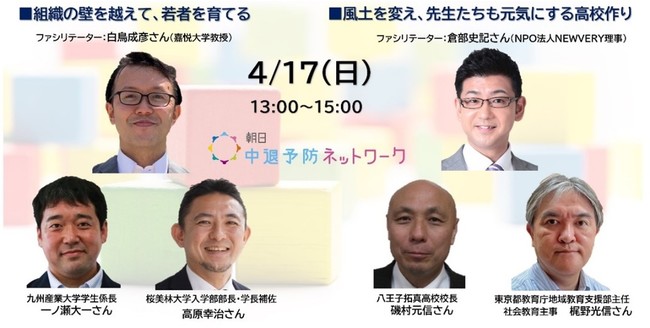 株式会社朝日新聞社(代表取締役社長:中村史郎)が立ち上げた朝日中退予防ネットワークは、若者の不本意な中退を未然に防ぎ、自らのキャリアを積極的に形成できるよう、教育関係者の皆様と共に考えるオンライン上の研究会です。活動2年目を迎える2022年度最初の公開セミナーでは、大学等の組織内でいかに教員と職員が連携する「教職協働」を実現するか、高校現場で先生が疲弊することなく生徒一人一人に寄り添えるか、「実践者」のお話を聞きながら、考えます。