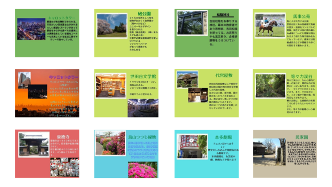 Scratchの基礎で操作やブロックの役割について学んだあとは、地域の魅力を発見するワークで世田谷区の魅力を調べて子供達自身に魅力カードを作ってもらいます。