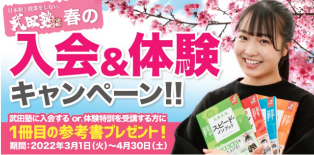 学習塾「武田塾」を運営する株式会社A.ver(所在地:東京都文京区、代表取締役:中森 泰樹、以下 武田塾)は、3月1日(火)より、春の入会&体験キャンペーンをスタートいたしました。3~4月の2ヶ月間実施し、入会者及び受講者には参考書1冊プレゼントの特典がつきます。
