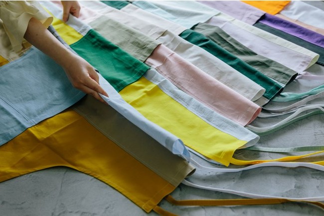 商品化に至らなかった見本生地やB品生地、端切れ扱いの1mに満たない生地など国内の生地メーカーから出る大量の残反を引き取って、有効活用したい。そんな想いから「ザンタンエプロン」が誕生しました。