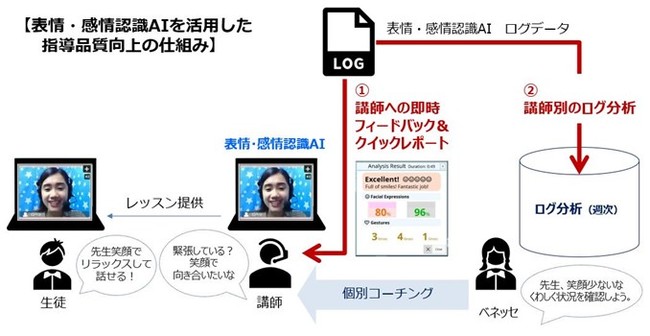 導入したのは、株式会社シーエーシー(東京都中央区)のオンラインコミュニケーション活性化支援ツール「心sensor for Communication」をベネッセ独自のレッスン品質管理ノウハウに基づきカスタマイズしたシステムです。本システムは表情・感情認識AIを搭載し、オンライン会議や研修でのコミュニケーションの課題を解決する目的で企業に採用されていますが、教育サービスでは初めての導入です。