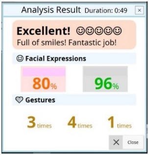 本システムでは、レッスン中の講師の表情やジェスチャーをAIで解析して視覚化し、即時に講師にフィードバックします。その結果、講師はリアルタイムで自身の指導を客観的に把握し軌道修正することができます。毎レッスン終了後にはクイックレポートが表示され、結果に応じたアドバイスを伝えることで、次のレッスンに向けて講師のモチベーションを高めます。(右図:クイックレポートのメッセージ例)