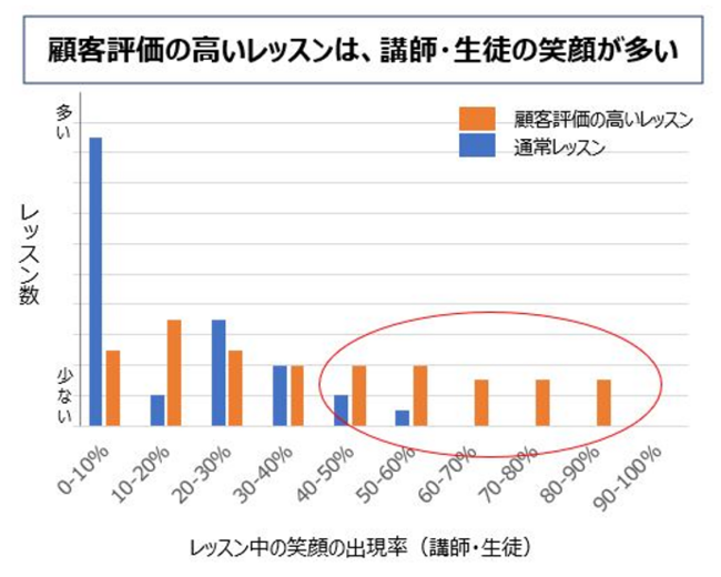 テスト導入の段階で、顧客評価が高いレッスンには「感情表現が豊かでジェスチャーが多用されている」という共通の傾向がみられたため、感情・ジェスチャーを解析観点として取り入れました。講師と生徒の笑顔が多く出現するレッスンは満足度が高い傾向にあることがわかったため(右のグラフ参照)、本システムでは、「笑顔」の頻度を重要指標の1つとしています。