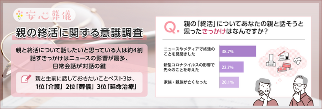 終活について親と話そうと思ったきっかけについては、1位が「ニュースやメディアで終活のことを見聞きした(38.7%)」、2位が「新型コロナウイルスの影響で先々のことを考えた(22.7%)」となり、5人に1人は新型コロナウイルスをきっかけに終活を意識しているという結果となりました。
