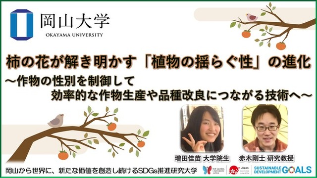 国立大学法人岡山大学(本部:岡山市北区、学長:槇野博史)の学術研究院環境生命科学学域(農)赤木剛士研究教授は、これまで柿やキウイフルーツを材料として植物の性別の研究に取り組んでおり、世界に先駆けて植物個体のオス・メスを決定する遺伝子群やその進化の過程を解明してきました。このたび、増田佳苗大学院生(大学院環境生命科学研究科博士後期課程3年)と、赤木研究教授は性別を持つ柿の花が、祖先である両性花へ先祖返りする仕組みの解明と、その中心的な働きを担う新しい遺伝子「DkRAD」の発見に至りました。