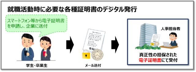 ● 就職活動に必要な各種証明書を、真正性を担保した電子証明書としてオンラインで企業に送付可能