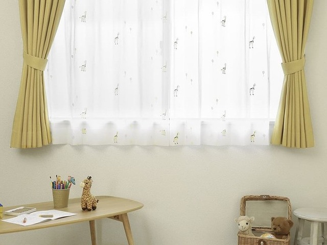 当店オリジナルデザインの“キリン柄刺繍”レースカーテン。子供たちから大人気のキリンさんを、繊細なタッチの刺繍で描いた可愛らしいデザインです。子供の“好き”を取り入れた愛らしいデザインで、笑顔あふれる明るい子供部屋に♪