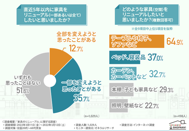そこで今回、家具インテリアの一括見積もりサービス『SHOPNAVI(ショップナビ)』(https://shop.heyagoto.com/consult)を運営する株式会社ヘヤゴト(https://heyagoto.co.jp/)は、全国20代~60代男女を対象に、「家具のリニューアル」に関する調査を実施しました。