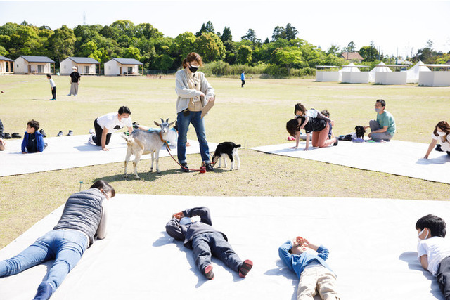 千葉のグランピング施設BUB RESORTのアイドルのヤギさん達と触れ合いながらヨガを行います。これほど近くで触れ合う体験は癒しと非日常を味わえます。