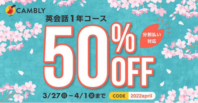 Cambly Inc.(本社:アメリカ・サンフランシスコ、日本代表:佐藤 亜希子)が提供するネイティブ講師とのオンライン英会話サービス「CAMBLY(キャンブリー)」は、3月27日(日)から4月1日(金)までの6日間、1年コースが50%OFFでご利用いただけるSpringセールを開催いたします。