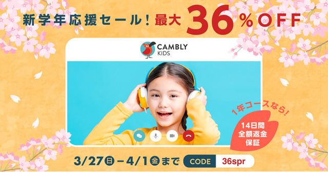 Cambly Inc.(本社:アメリカ・サンフランシスコ、日本代表:佐藤 亜希子)が提供する子ども向けオンライン英会話サービス「Cambly Kids(キャンブリー キッズ)」は、3月27日(日)から4月1日(月)までの6日間、全てのプランを15~36%オフでご利用いただける新学年応援セールを開催いたします。 https://bit.ly/ck-36spr