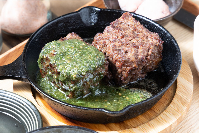 鉄板にのせた肉厚ハンバーグに、大葉・胡桃・チーズなどの素材で構築した緑色のソースをたっぷりとかけて提供します。味はもちろんのこと、視覚や嗅覚でもお楽しみいただける一品となっております。