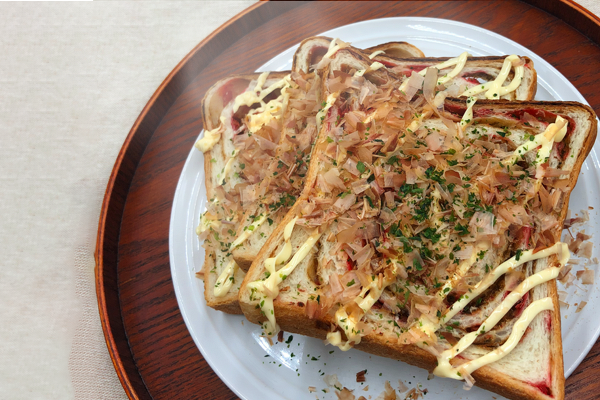 一口食べるとこってりソースにしゃきしゃきとした生姜のアクセント、鰹節と青海苔の風味が口いっぱいに広がります。写真のようにトーストした後、追いマヨネーズ&鰹節・青のりでアレンジしていただくと更にお好み焼き感を味わっていただけます。