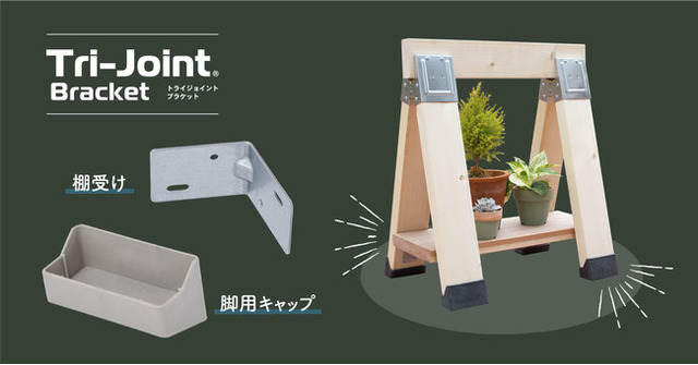 市販の2×4材を使って、ウッドスタンドを簡単に作ることができる金具「トライジョイントブラケット」。出来上がったウッドスタンドは、作業台はもちろん、ハンガーラックや傘立て等として活用でき、アイデア次第で様々な使い方が可能です。国産ならではの仕上がりの美しさ・細かな設計で、より本格的なDIYを感じられます。そんなトライジョイントブラケットのシリーズから新たに販売するのが、「棚受け」「脚用キャップ」です。