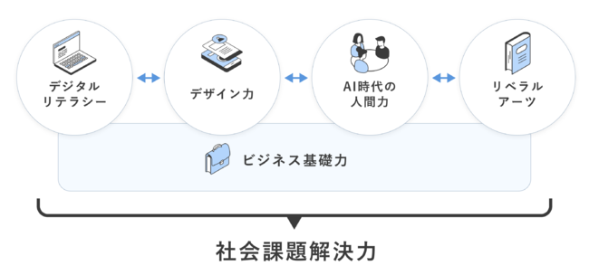 「ビジネス基礎力」「デザイン力」「デジタルリテラシー」「AI時代の人間力」「リベラルアーツ」の5つの領域は、日々の生き抜くビジネススキル、データやデジタルの価値を最大化する力、AI時代の人間の役割、イノベーショションの源泉、未来を創造する力ーーを示しています。
