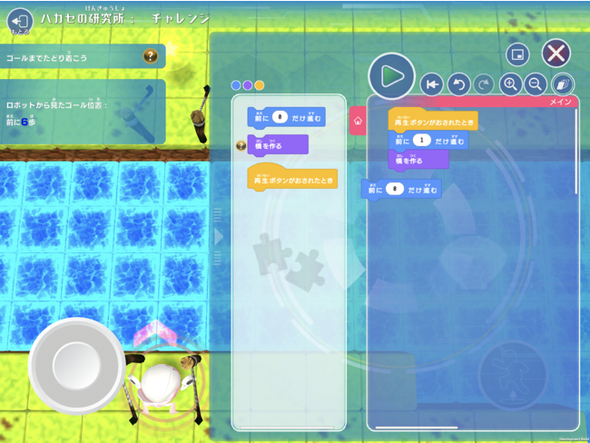 ビジュアル言語(日本語)により、パズルを組むようにプログラミングの基礎を学ぶことができます。