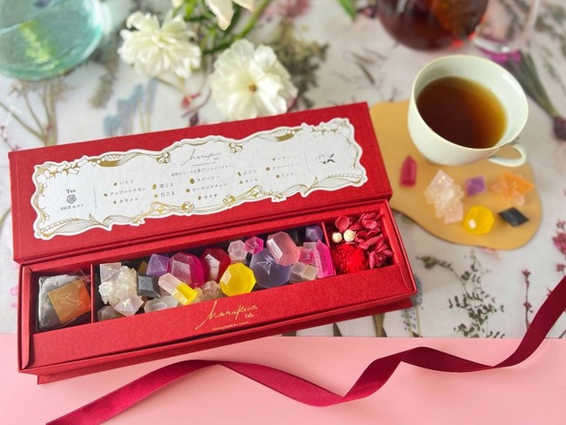 シックな赤と金の箔押しラベルで出来た心トキメク採取箱に、麗しくカットされたこうぶつのかけらたちがたくさん詰まっています。こだわりの和紅茶とともに癒しの時間を。