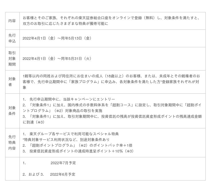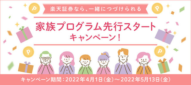 楽天証券株式会社(本社:東京都港区、代表取締役社長:楠 雄治、以下「楽天証券」)は、本日、2022年4月1日(金)より、「家族プログラム」の先行申込を開始したことをお知らせします。また、先行特典がもらえるキャンペーンも開始しましたので、あわせてお知らせします。