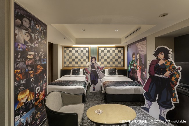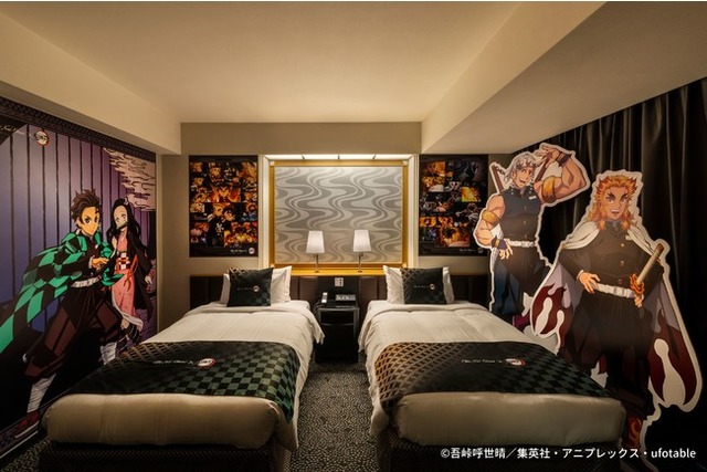 2022年4月1日(金)からの『煉獄・宇髄ルーム』は、『テレビアニメ「鬼滅の刃」無限列車編』と『テレビアニメ「鬼滅の刃」遊郭編』の場面写真を使用した新たな装飾へとリニューアル。炎柱・煉獄杏寿郎や音柱・宇髄天元が活躍した名場面に思いを馳せながら、ホテルの制服を身にまとった、ufotable描き下ろしキャラクターたちとの特別な滞在をお愉しみください。