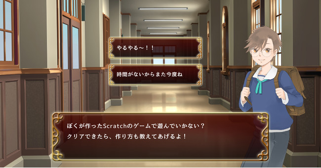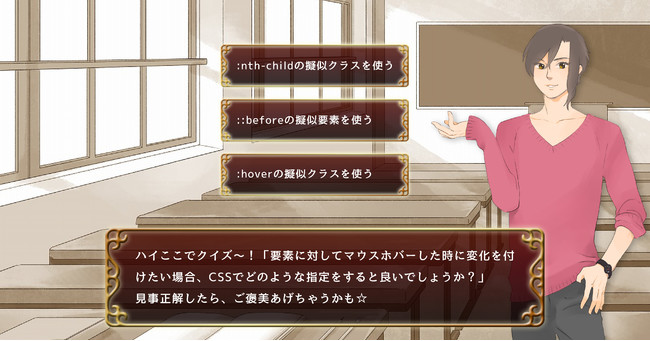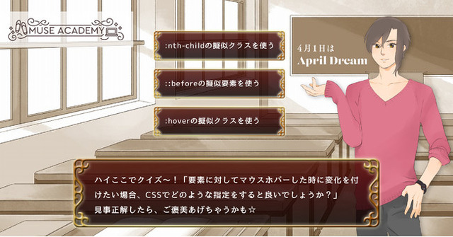 そこで、Muse Academyは学習カリキュラムを架空の学校の授業に置き換え、講師やさまざまなキャラクターと対話式のコミュニケーションを取ることで、自然とデザインやライティングのスキルが身に付き、キャラクターとの親密度が上がる「乙女ゲーム形式」の教材を開発いたしました。