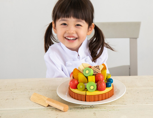 いちごやキウイ、パイナップルなど、様々な形のフルーツを自由に盛り付けて、世界にひとつのフルーツタルトを作ることが出来ます。配置や彩りを考えながら盛り付けて遊ぶことで、パティシエ気分を味わいながら空間認識力や色彩感覚、造形力の発達を促します。幼児教室うまれの知育玩具メーカーならではの確かな知育要素と、小山進氏監修ならではの「本物」にこだわった、こどもの想像力と感性を育む本格的なおままごとアイテムです。