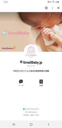アストラゼネカ株式会社(本社:大阪市北区、代表取締役社長:ステファン・ヴォックスストラム、以下「アストラゼネカ」)は、このたび、在胎37週未満で生まれた早産児の保護者を対象にRSウイルス感染症対策をサポートするため「SmallBaby.jp」のLINE公式アカウントを開設しました。当アカウントを通じ、RSウイルス感染症についての情報や流行状況、通院リマインダーなど育児生活に役立つ情報をお届けします。本サービスはトランスコスモス株式会社(本社:東京都豊島区、代表取締役社長兼COO:奥田昌孝)が有する LINEを活用した独自開発APIプラットフォーム「DEC Connect(デックコネクト)」を介し、それぞれの患者さんに適した情報を配信、通院リマインダーなどコミュニケーションのデジタル化を可能にしています。