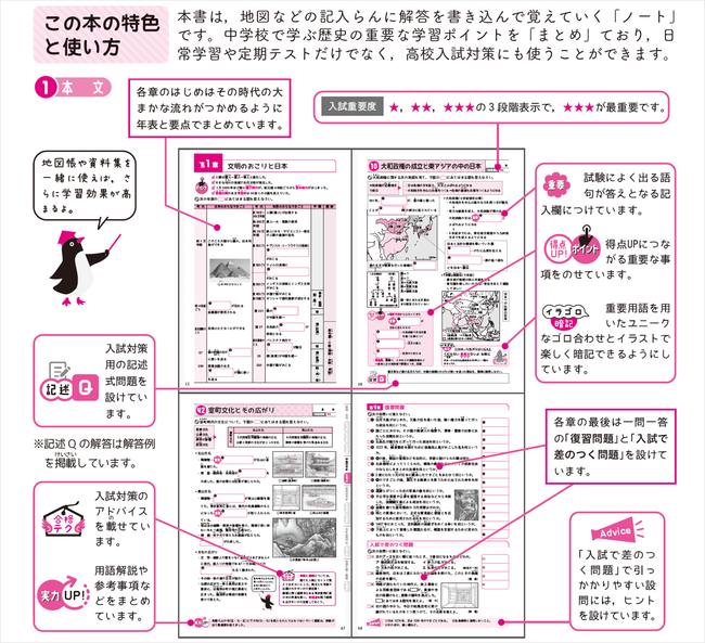 各単元に関係する地図や図表を使って、歴史の重要ポイントをまとめ、空所に答えを書きこみながら学習ポイントを整理。定期テストから入試対策まで幅広く活用できます。歴史で地図を扱う問題対策としてうってつけです。