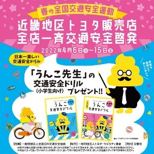 株式会社文響社(所在地:東京都港区、代表取締役:山本周嗣)は、トヨタ自動車販売店協会近畿支部とコラボレーションし、4月6日~15日の「春の交通安全運動」の期間中、「うんこ交通安全ドリル(歩行者編・自転車編)」の冊子を、近畿地区のトヨタ販売店全店にて幅広く配布いたします。