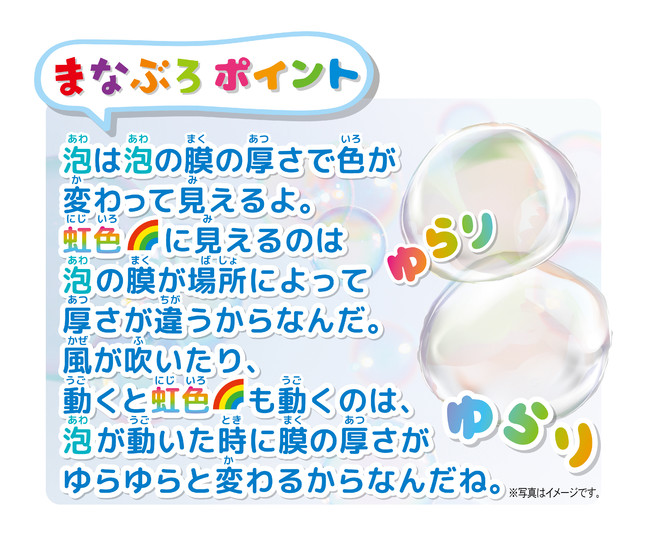 ゆらゆら揺れる泡をよ~く観察してみると、どんな色になるのか発見できるかもしれません。