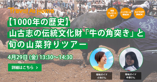オンライン旅行に特化したマッチングサービス「Travel At Home」を運営する株式会社Torch(本社:東京都渋谷区、代表取締役:木村駿介)は、山古志農泊推進協議会と提携し、新潟県中越地域「山古志」の地域おこしに繋がるイベント「山古志の伝統文化財【牛の角突き】と旬の山菜狩りツアー」を開催致します。