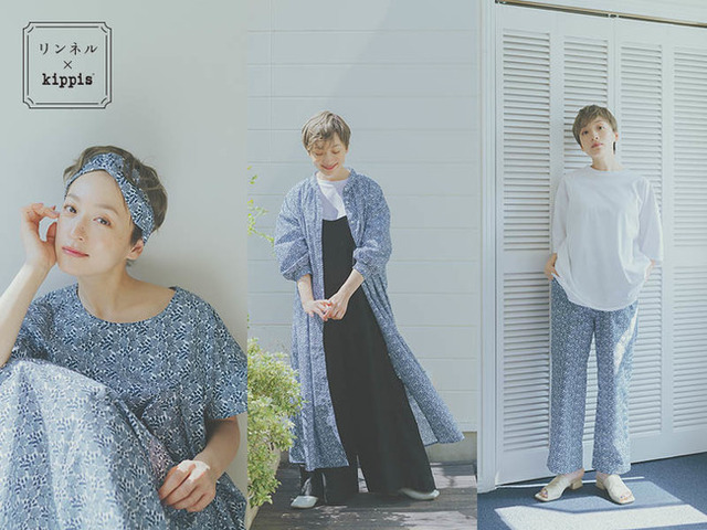 『リンネル』とkippisのコラボによって今回、誕生したファッションアイテムは全6種類。うち5点が、オリジナルの小花柄、ルース(Russu)柄のテキスタイルを用いたアイテムです。ラインアップは、着るだけでサマになるワンピースや、セットアップとしても使えるブラウスとロングスカート、パンツ、つけるだけで洒落感をプラスしてくれるヘアターバン。