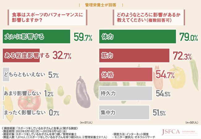 スポーツをしているお子さんの食事について調査を行ってみると、食事とスポーツのパフォーマンスの関連性が見えてきました。