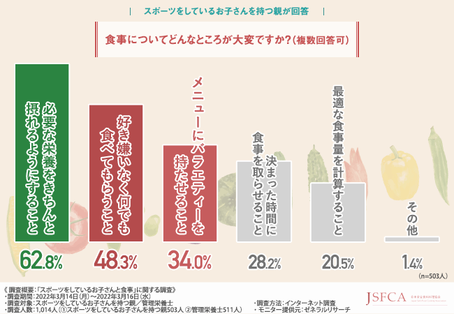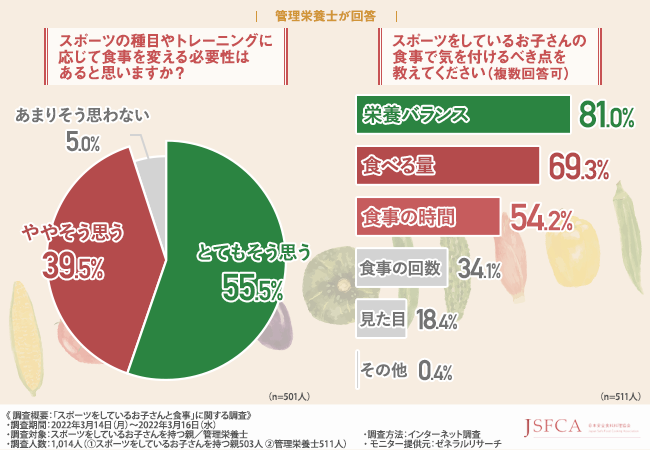 日本安全食料料理協会(所在地:東京都港区)は、1.スポーツをしているお子さんを持つ親2.管理栄養士を対象に、「スポーツをしているお子さんと食事」に関する調査を実施しました。
