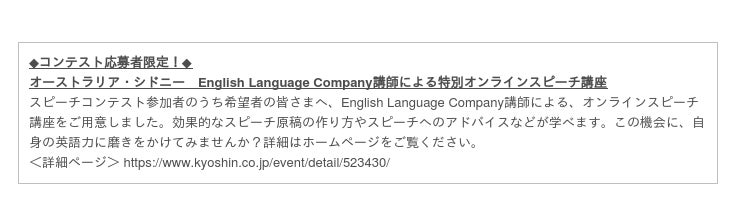 TEL:075-354-5272(平日10:45~19:00)E-mail:speechcontest@kyoshin.co.jp