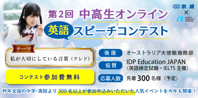 京都・滋賀・愛知を中心に全国で学習塾を展開する京進は、「京進×English Language Company 第2回中高生オンライン英語スピーチコンテスト」を、語学学校業界における世界的な賞「ST Star Awards」で、南半球最優秀語学学校の殿堂入りをしているオーストラリアの語学学校、「English Language Company」と共同で開催いたします。本年は協賛に、全世界での年間受験者数が350万人を超えるグローバルな英語4技能試験「IELTS(アイエルツ)」を運営するIDP Educationを迎え、「私が大切にしている言葉(クレド)」をテーマに、全国の中高生から英語スピーチを募集します。一次予選の通過者は、7月から8月にかけて行われるセミファイナルとグランドファイナルにて、オンラインでのスピーチ発表をしていただきます。