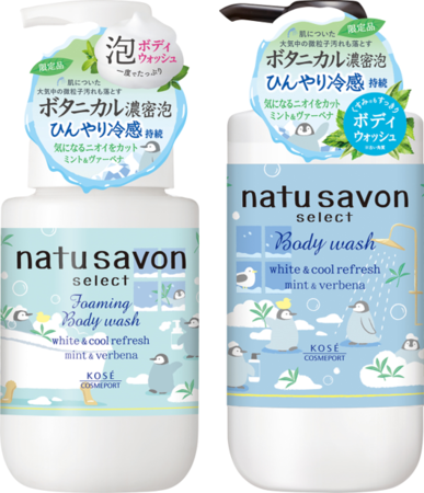 今回発売する「ソフティモ ナチュサボンセレクト ホワイト ボディウォッシュ ミント&ヴァーベナの香り」は、清涼感の高い使用感で、べたつく肌もひんやりクールに洗いあげます。ボタニカルの恵みを凝縮したもっちり濃厚泡で肌をやさしく包み込み、古い角質・くすみ※1もスッキリ落としてくれる「液体タイプ」と、ボタニカルの恵みを凝縮したたっぷりのふわふわ泡で肌をやさしくなでるだけで、すっきりすべすべ肌に導く「泡タイプ」の2タイプをラインナップしました。