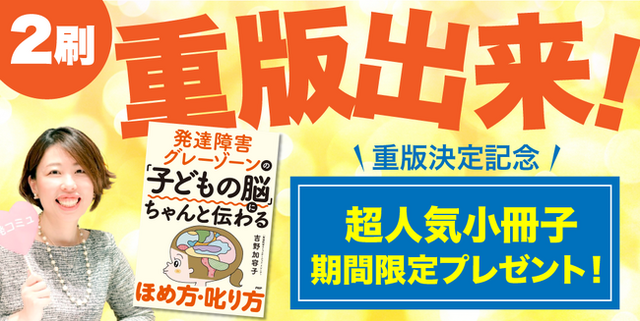 発達障害・グレーゾーンのお子さんの本来の個性に目を向けて、「人生をうまくやっていけるスキル」を身につけさせ、可能性を広げる「発達科学コミュニケーション」の基本をまとめた書籍、「発達障害・グレーゾーンの『子どもの脳』にちゃんと伝わるほめ方・叱り方」の2刷重版が決定いたしました。