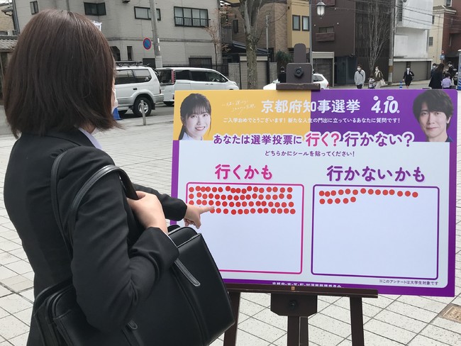 京都府選挙管理委員会は、4月10日(日)執行「京都府知事選挙」の広報PRとして、京都の6つの大学の入学式会場にて、新入生を対象に投票に「行くかも」「行かないかも」のどちらかを選ぶ、アンケート調査を実施しました。
