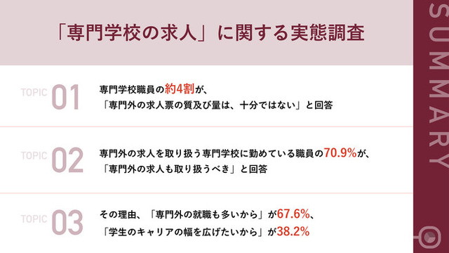 まず、専門学校の約半数が、「カリキュラムに関係がない専門外の求人の取り扱い」があることが分かりました。一方で、専門学校職員の約4割が、「専門外の求人票の質及び量は、十分ではない」と考えていることが明らかとなりました。