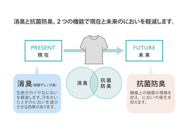 生乾きのイヤなにおいを軽減します。汗をかいたときのにおいを減少させる効果があります。