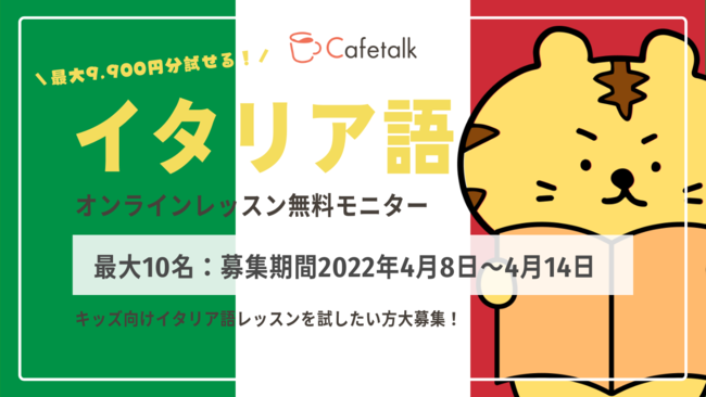 世界中の講師と生徒をつなぐオンライン習い事サイト「カフェトーク(http://cafetalk.com/)」を運営する株式会社スモールブリッジ(本社:東京都渋谷区、代表取締役:橋爪小太郎)は、オンライン/マンツーマンで実施される子供向けイタリア語レッスンをお試しいただけるモニター様10名を2022年4月8日~4月14日の日程で募集しています。