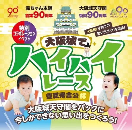 大阪の企業であり、大阪から生まれた「赤ちゃん本舗」が、大阪の中心で長く愛され続ける「大阪城天守閣」と共に、90周年という節目にコラボレーションします。これまでコロナ禍で様々なイベントが中止になる中、『大阪からの子育て支援』として、屋外での今しかできない思い出づくりとなるよう特別企画のハイハイレースを開催いたします。