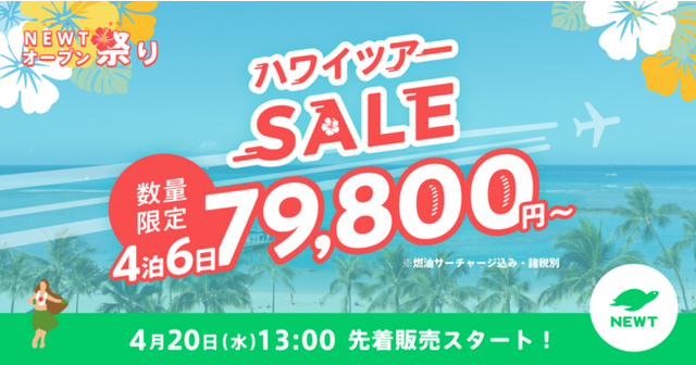 「あたらしい旅行を、デザインする。」をミッションにする海外旅行代理店業の株式会社令和トラべル(本社:東京都渋谷区、代表取締役社長:篠塚 孝哉)は、海外旅行予約アプリ『NEWT(ニュート)』のサービス提供及びハワイツアー販売開始を記念し「NEWTオープン祭り」を開催いたします。『NEWT』アプリ会員限定で、夏休み期間を含む指定日に出発するハワイツアーを、4泊6日79,800円(税別)など、大変おトクな価格でご用意いたしました。4月20日(水)13時より、先着40組限定で販売いたします。