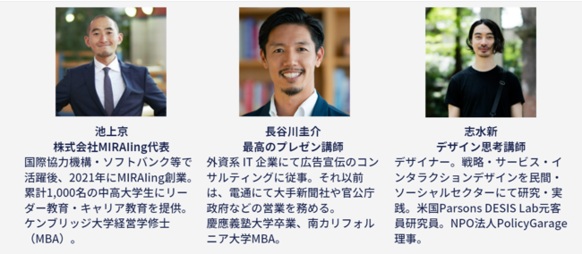 株式会社MIRAIing(ミライング)は、 「輝く未来を創る優れたリーダー・イノベーターとともに社会を前進する」をビジョンに掲げるリーダー学習企業です。中高生・大学生向けに、ケンブリッジ大学等海外トップ大学のプログラムをベースに質の高いインプットとアウトプットに3ヶ月間濃密に取り組む、 体系的リーダーシップ・プログラム「TOPPA」を提供しています。学校へのプログラム提供も含め、これまで累計1,000名以上の学生にリーダー教育・キャリア教育を提供してきました。