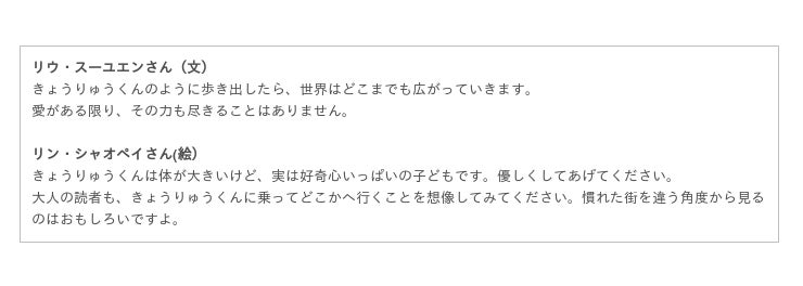 体が大きくてわんぱくっ子、でもとってもお友達想いの“きょうりゅうくん”が主人公の「きょうりゅうバス」シリーズは、台湾の子どもで知らない子はいないというほど親しまれているロングセラー絵本。心あたたまるストーリーはもちろん、産経児童出版文化賞・翻訳作品賞を受賞した台湾の人気作家・リン・シャオペイさんが描く、鉛筆、水彩、デジタルを用いたコラージュ風の絵が想像力をかきたてます。