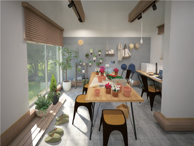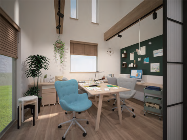 頑強な鉄骨構造を生かしたオープンな大空間と、全館空調システム「エアロハス」による家じゅう快適な温度環境により、どこでも自由に「学び」「在宅ワーク」ができる空間を提案します。親子のコミュニケーションが活性化され将来の家族構成やライフスタイルの変化に対してもフレキシブルに使い続けられるマルチな空間としては、「大空間のリビングダイニング」をはじめ、家族で協同作業ができる「家族のアトリエ」、居室やホールに設けた「スタディコーナー」、汚れを気にせず楽しめる「学びの土間スペース」等があります。これらは、パナソニックホームズと学研による調査で判明した実態に基づき、『KODOMOTTO』ならではの空間として提案するものです。